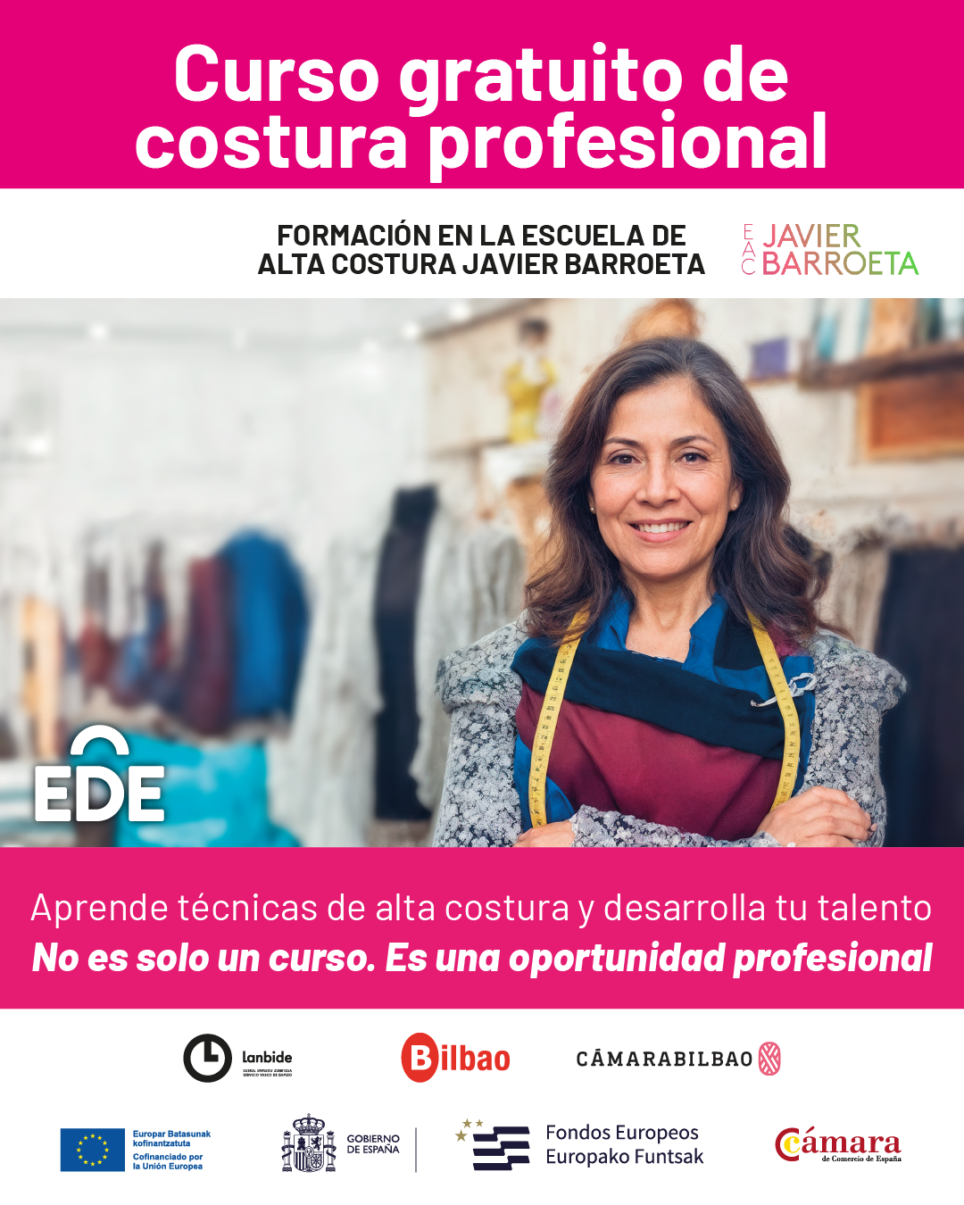 El taller de costura profesional en la Escuela de alta costura Javier Barroeta ha comenzado, el pasado mes de marzo, en Bilbao. Una iniciativa, que EDE Empleo ofrece a 16 mujeres de entre 45 y 60 años en situación de desempleo, una oportunidad para reinventarse profesionalmente en el sector textil.