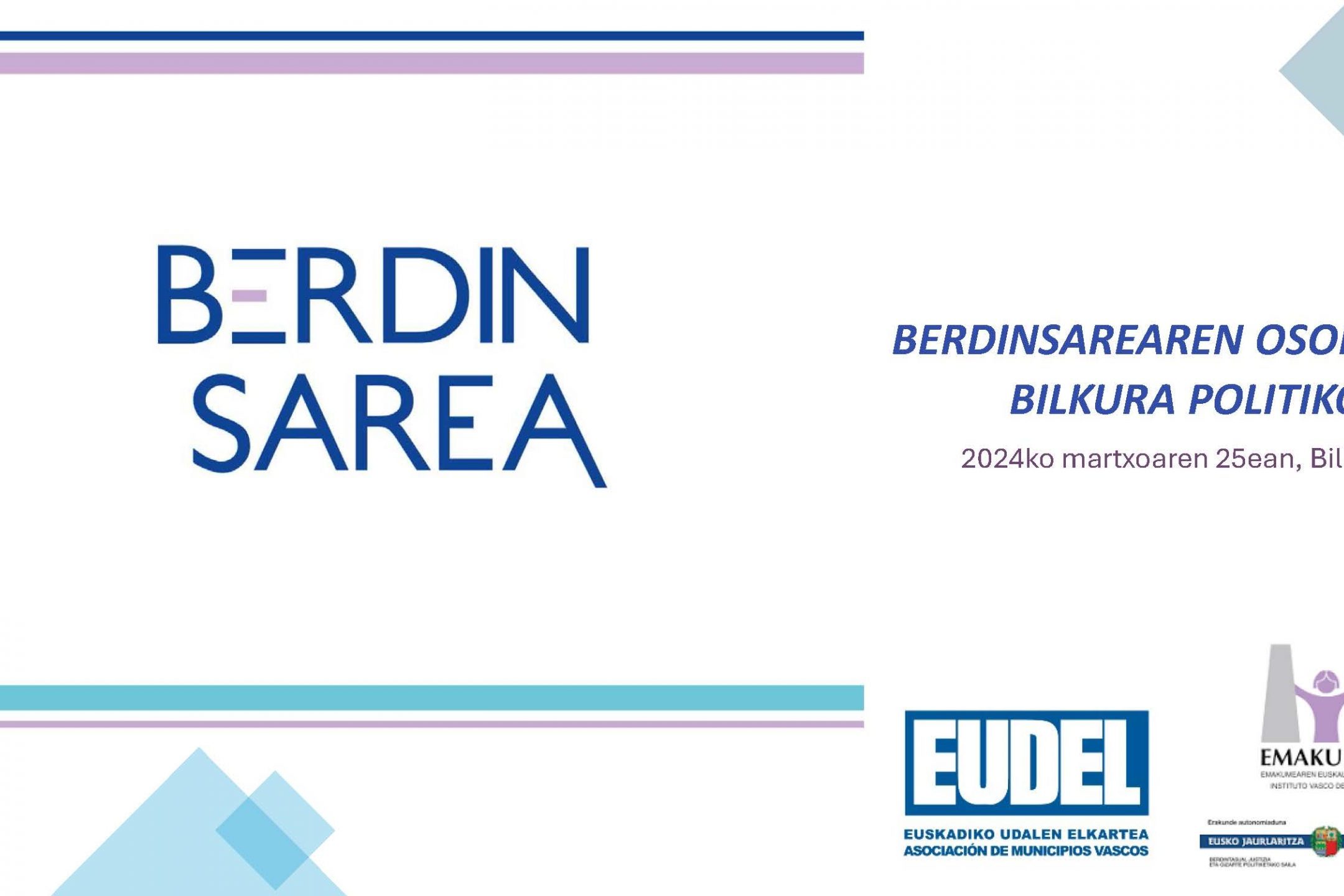 Emakundek eta Eudelek bultzatutako Berdintasunaren aldeko eta Indarkeria Matxistaren aurkako Euskadiko Udalen Sarea, Berdinsarea, lagunduko dugu datozen bi urteetan. Berdinsarearen helburua da arlo horretako programak eta jarduerak bultzatzea toki-eremuan, esperientzien trukea erraztea, koordinazioa, lankidetza-hitzarmenak sustatzea, berdintasun-politikak aztertzea eta hausnartzea, berdintasunaren eta indarkeria matxistaren aurkako gaietan udal-jardunbide egokiak identifikatzea eta zabaltzea, eta udalerriei laguntza teknikoa ematea. Horrela, tokiko gobernuek arlo horretan ematen duten erantzunaren eraginkortasuna hobetu nahi da, bai eta horien eta beste erakunde batzuen arteko loturak ere.